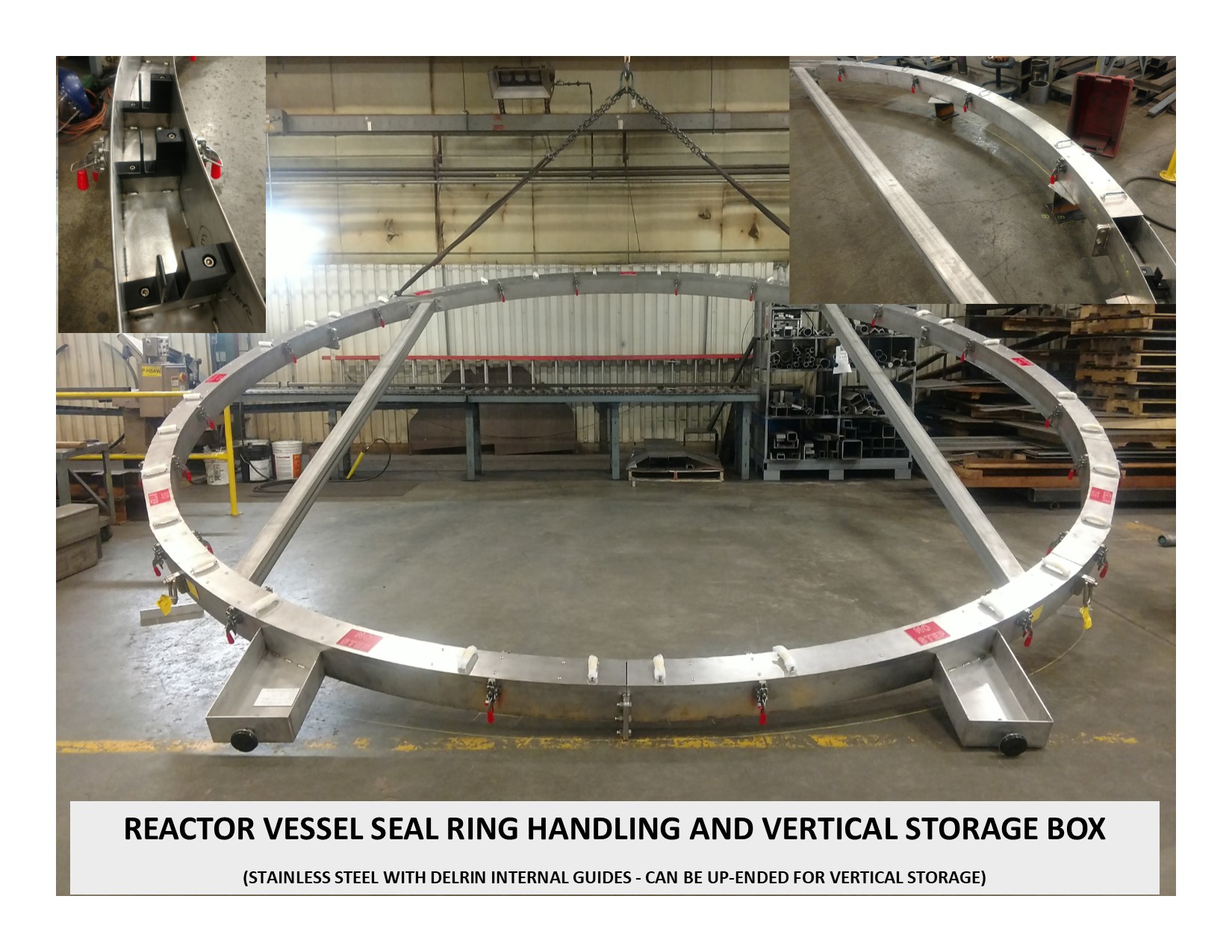 A stainless steel adjustable height reactor vessel O-Ring support tray assembly used to pre-stage and protect to O-Rings prior to installation on the underside of the reactor head. This was designed and built for Brown's Ferry Nuclear Station in Athens, Alabama